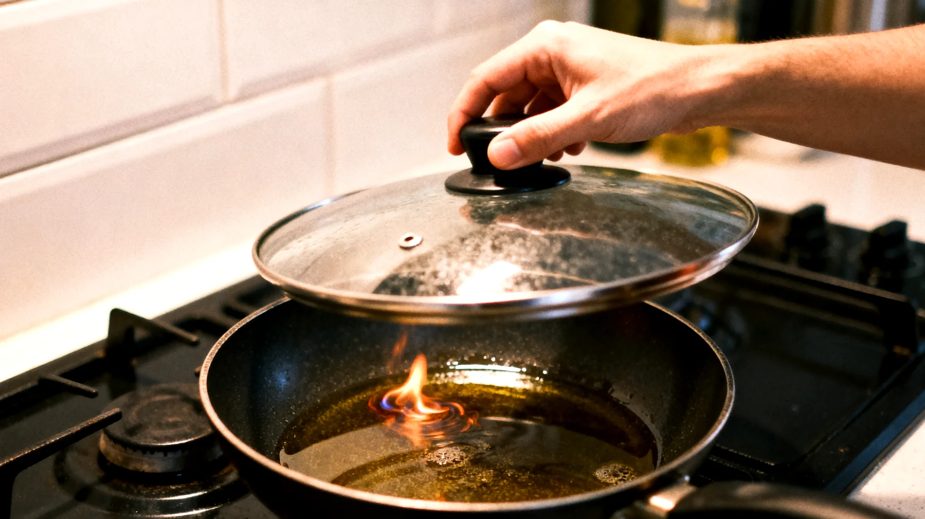 Das richtige Vorgehen bei einem kleinen Fettbrand folgt einer klaren Sequenz: